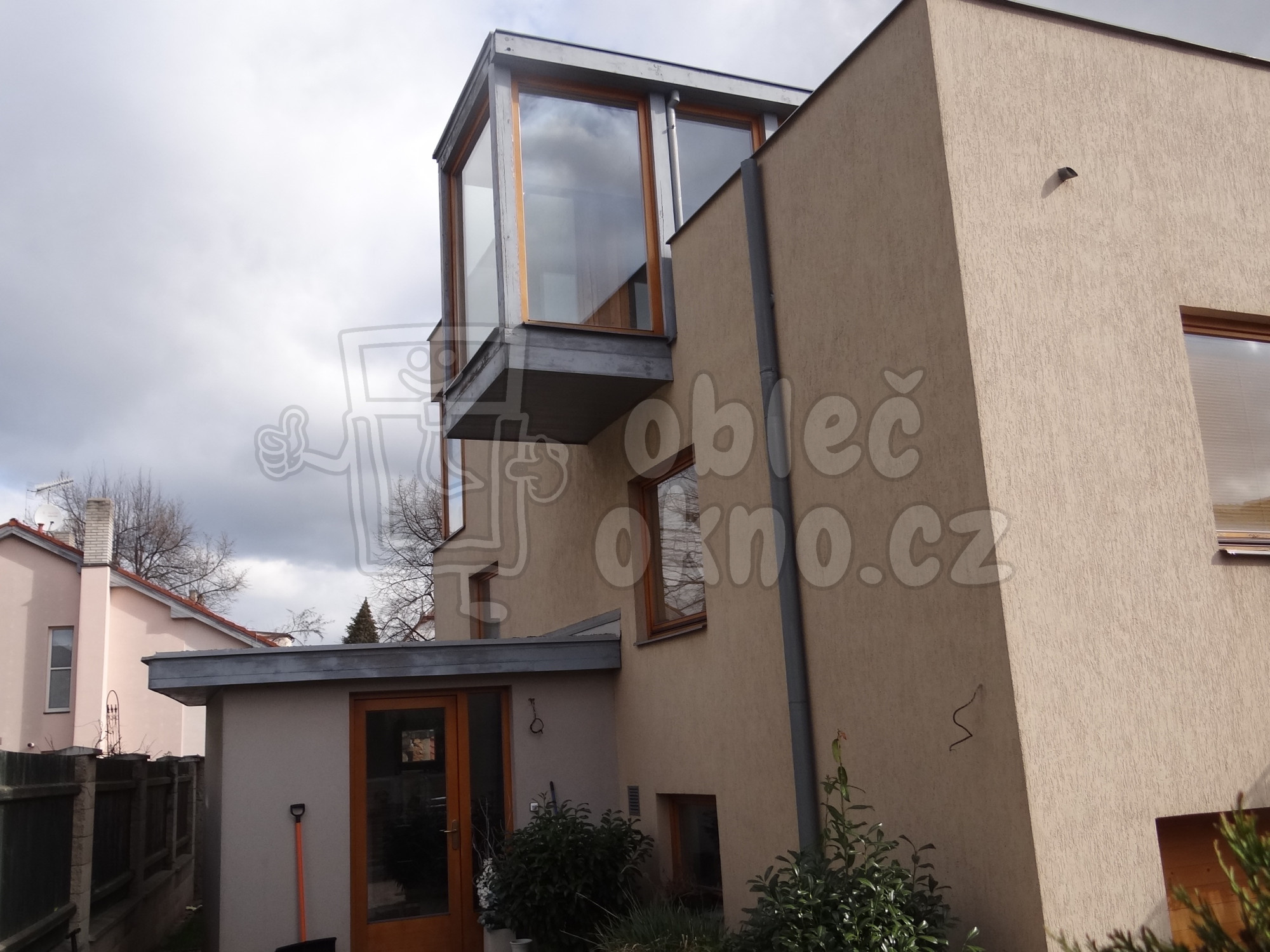 Renovace různých typů dřevěných oken na rodinném domě v Roztokách u Prahy. Modernistická stavba s výraznou kubickou architekturou, plochou střechou a proskleným výklenkem v horním patře má několik typů dřevěných oken, rohových oken a dveří. Původní vzhled dřeva se klient rozhodil nahradit tmavě šedým metalickým dekorem, který elegantně doplňuje vzhled budovy.
